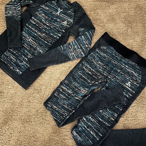 Housut sekä sininen paita, ohuempaa , kevyttä merinovillaa.