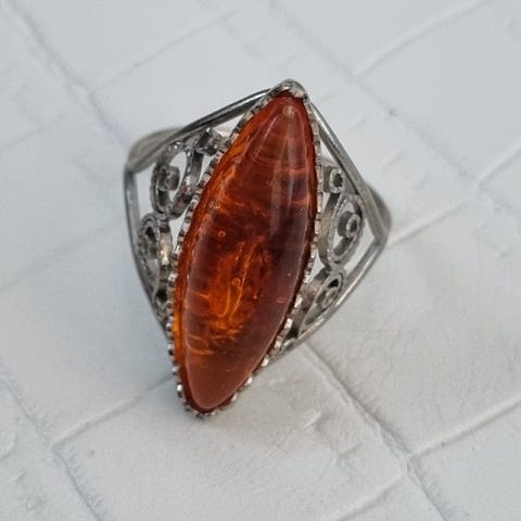 Suloinen siro vintagesormus. Perhonen noin 8 x 10 mm. Säädettävä koko, tällä hetkellä noin 18. Hopean leimoja en löytänyt. Sormus. Meripihkankeltainen kivi vähän vinossa istutuksessa ja perhonen etukenossa, mutta sehän vain tekee korusta persoonallisen.