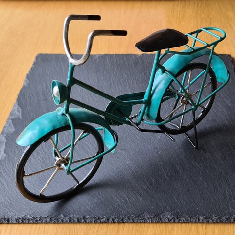 Kohteistani löytyy myös ilmoitus mitoiltaan vähän pienemmästä metallisesta koriste polkupyörästä. Mielestäni se on tehty vähän enemmän kulutetun näköiseksi.