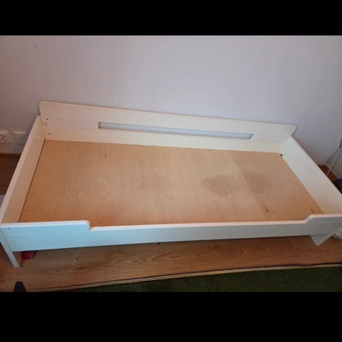 Lasten klassinen, jatkettava sänky. Kunto hyvä, mutta muutamia pieniä kolhuja ja lisäksi yhdellä reunalla kolme näkyvämpää jälkeä.