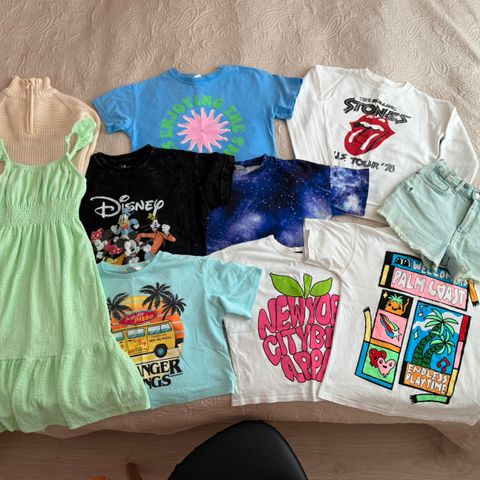 Vaatepaketti tytöille, koko 140-150cm. Kunto kohtuullinen, mukana farkkushortsit, jumppahousuja, leggarit, collegehousut, housut, mekko, paitoja.