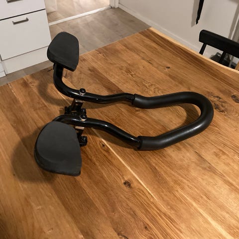 Mustat aerobaarit, joissa on pehmusteet käsille ja kyynärpäille. Sopivat pyörän ohjaustankoon kiinnitettäväksi, parantavat ajoasentoa ja mukavuutta erityisesti triathlon- tai kilpapyöräilyssä.