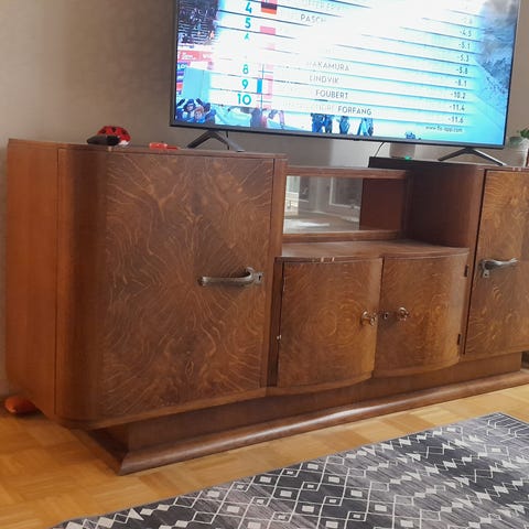 Vintage-tyylinen puinen senkki, jossa on kolme ovea ja kolme laatikostoa. Senkissä on metalliset lukot ja puujalat. Sopii säilytykseen ja sisustukseen ja tämäkin elämää nähnyt.