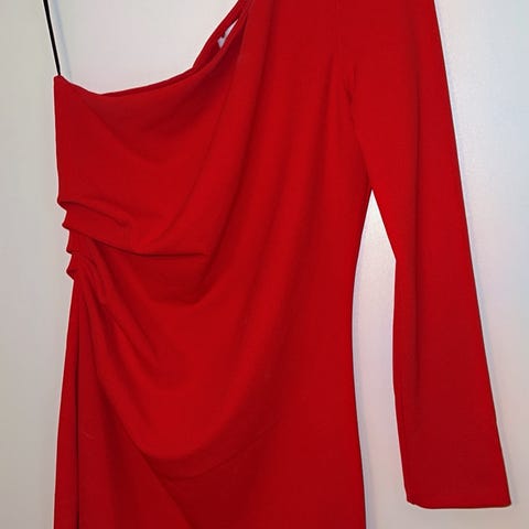 Puna-valkoinen juhlamekko, sopii hyvin pikkujouluihin. Koko 42, vastaa hyvin kokoaan. Yläosan ympärysmitta venyttämättä 90 cm, äärimmilleen venytettynä 100 cm. Vyötärön ympärys 80 cm. Kangas ei jousta. Mekon pituus on kainalosta helmaan 85 cm. Kiiltävässä kankaassa on pieniä hopeanvärisiä pilkkuja. Mekko on olkaimeton, mutta yläosassa on paikat, joihin voi kiinnittää olkaimet. Vyö on irroitettava, vyölenkit vyötäröllä sivuissa. Selkäosassa joustava kuminauharypytys. Sivussa vetoketju. Sisäpuolella valkoinen alushameosa, joka on kapeampi kuin mekon helma.
