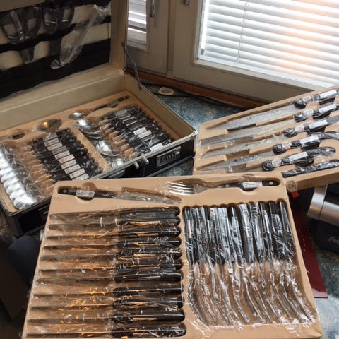 Myydään WMF:n laadukas steak set, jossa 8 veistä ja 8 haarukkaa puisessa laatikossa.