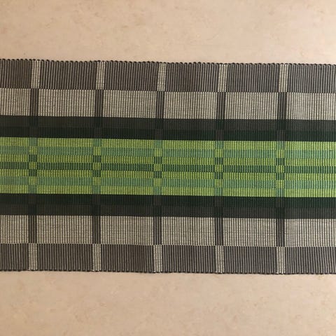 Hyvin kudottu suorareunainen ja tukeva mustavalkoinen kaitaliina, jossa yhtenä lankana muös kimalletta. Kiiltää siis mustissa kohdissa. Pituus 180 Leveys 47 Molemmin puolin samanlainen. Täysin ehjä. Kuvissa varjoja. Voin tuoda lähistölke kympillä tai postittaa eri hintaan