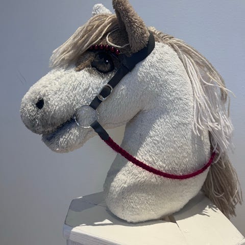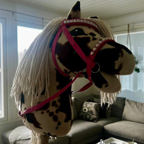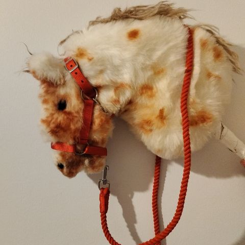 Valkoinen keppiheppa mustilla pilkuilla. Mukaan punainen riimu.