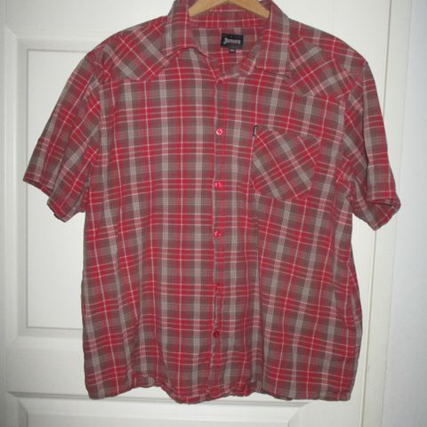 Lähes käyttämätön kauluspaita, ruskea-valkoruudullinen. Edessä napitus, paitsi toiseksi ylimpänä neppari, nepparilliset rintataskut, hihansuissa neppari ja nappi. 100% puuvilla.
