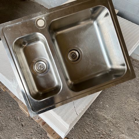 Käyttämätön teräsallas, hajulukko ja viemäriputki.