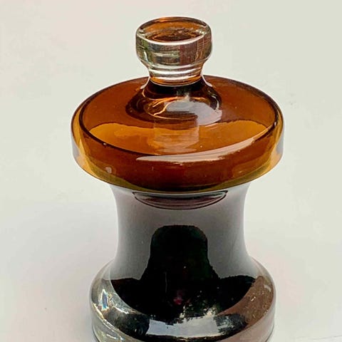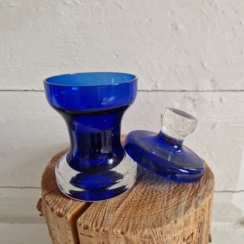 Koboltinsininen lasipurkki, suunnittelija Sirkku Kumela-Lehtonen. Kokonaiskorkeus kannen nuppiin asti n. 15,5 cm. Nouto Lauttasaaresta.