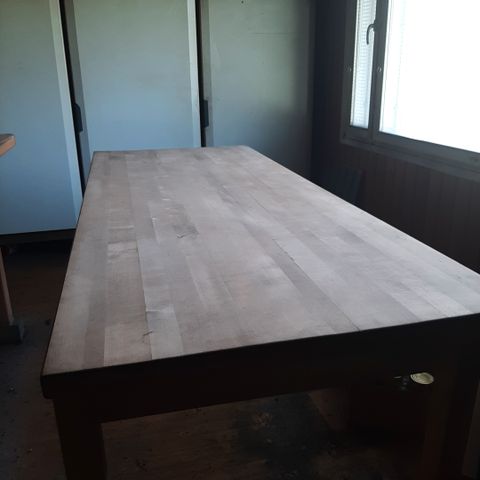 Vanha puinen työpöytä, jossa on sinivalkoinen väri ja kaksi vetolaatikkoa. Pöytä on tarkoitettu työskentelyyn tai säilytykseen. Pöydän pinta on kulunut ja siinä näkyy käytön jälkiä.