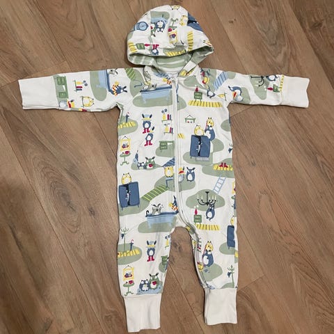 Myydään popin hyväkuntoinen kollarihaalari kokoa 68. Leveät käännettävät resorit hihansuissa ja lahkeissa, joten menee pitkään. Valkoinen pohjaväri, värikkäät eläimet. Hupussa korvat.