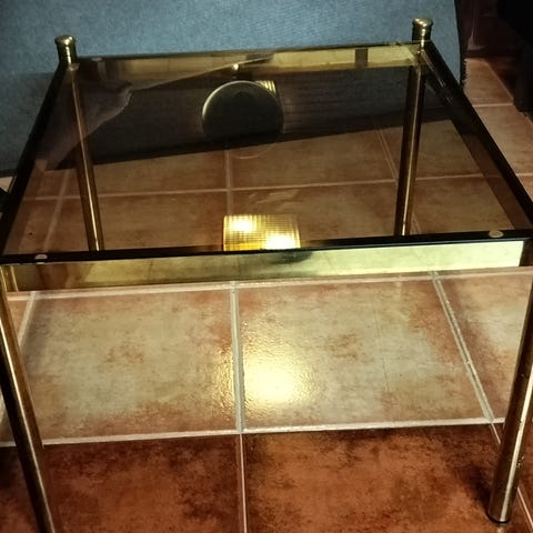 Upea midcentury-tyylinen lasipöytä messinkijaloilla. Mitat: korkeus 49 cm, leveys 70 cm ja pituus 130 cm. Lasi on ruskeaantaittavaa savulasia. Muutamia naarmuja lasissa. Kuljetus pääkaupunkiseudulle sovittaessa.