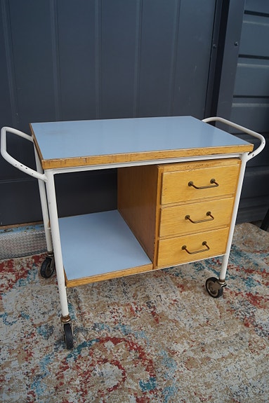 Vanha sininen metallinen myyntihyllykkö pyörillä.
