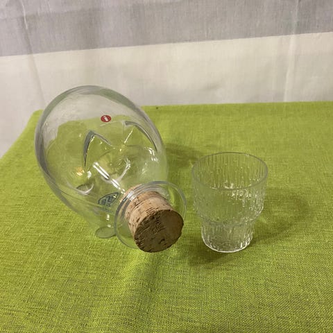 Valto Kokon Iittalalle suunnittelema lasinen viinapossu. Korkki hukkunut, muuten uuden veroinen. Pohjassa kaiverrus HV Iittala 2014.