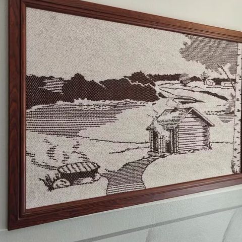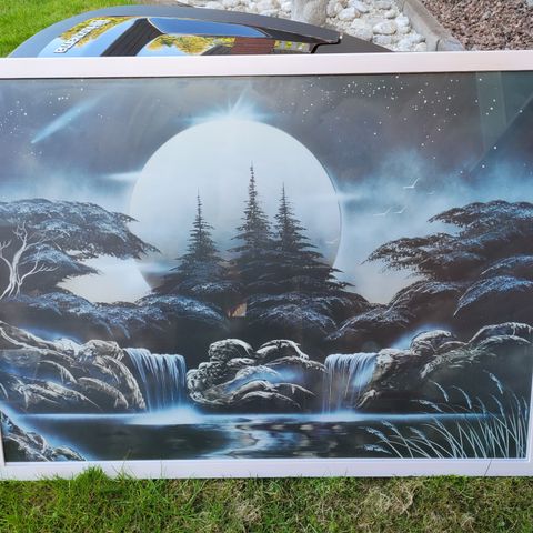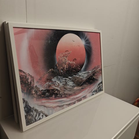 Iso vaaleanpunainen maisema taulu. Ikean kehykset. Ostettu joskus torilta/markkinoilta missä maalattu käsin spraymaalilla tms? paikanpäällä.