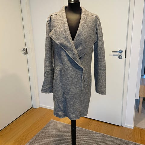 Myynnissä hyväkuntoinen, harmaa villakangastakki vyöllä.