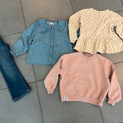 Vaatepaketti, koko 110. Mukana erilaisia vaatekappaleita, kuten pitkähihainen paita, mekko, paitamekko ja farkut. Värit vaihtelevat valkoisesta, punaisesta, sinisestä ja vaaleanpunaisesta. Materiaalit sisältävät puuvillaa ja muita kankaita, jotka soveltuvat arkipukeutumiseen