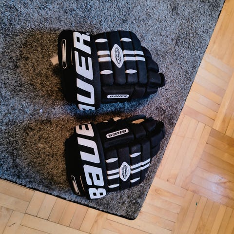 Bauer jääkiekko hanskat, musta ja valkoinen väri. Käytetyt hanskat, joissa näkyy kulumaa ja reikiä kämmenpuolella. Soveltuvat jääkiekkoon. Materiaali ja koko eivät ole tiedossa.
