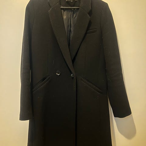 H&M pitkä musta mekko-tyyppinen takki naisille, koko S. Takissa on kaksirivinen napitus, klassinen malli. Sopii erilaisiin tilaisuuksiin ja arkeen.
