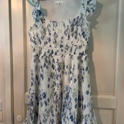 Mekko paksumpaa vähän joustavaa materiaalia, sopiva talvikäyttöön. Hihat vajaa mittaiset ja pituus 170cm vähän yli polvien.
