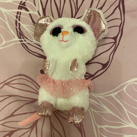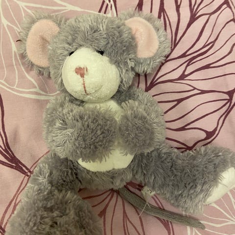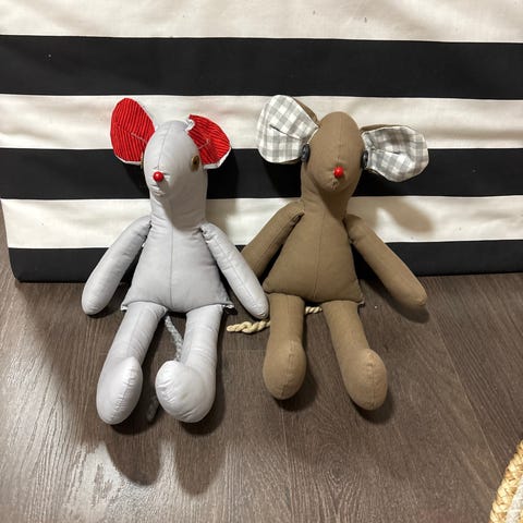 Pehmolelut, hiiri ja pupujussi, pehmeä materiaali, lasten lelu. Hiiri on harmaa ja pupujussi valkoinen ruskeilla korvilla ja tassuilla, pupujussilla vaaleanpunainen rusetti kaulassa.