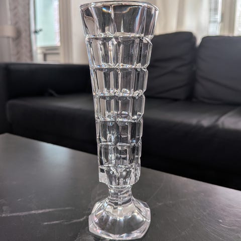 Kristallimaljakko. 24% lyijykristallia Cristal d Argues. Kuusikulmainen, korkeus 8 cm. Koristeena käytetty.