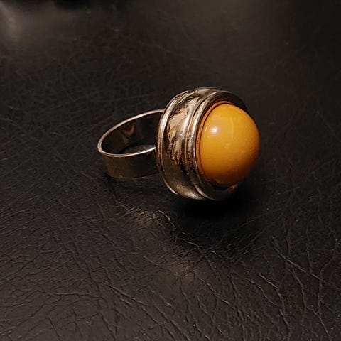 Kullan sävyinen yksityiskohtainen sormus kiven näköisillä muovikoristeilla. Koko tuntuisi olevan 19+, selvitän tarkemmin tarvittaessa.