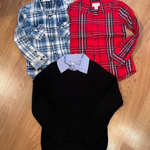 Poikien Mayoral Slim Fit kauluspaita koko 134, vaaleansininen raitakuosi ja pieniä kuvia. Poikien Mayoral neulepaita koko 134, musta, keltainen ja ruskea väritys, kuvioitu malli. Molemmat vaatteet ovat kokoa 134. Käytetty.