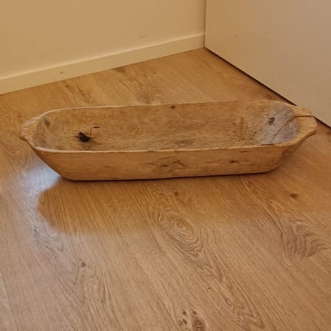 Vanha yhdestäpuusta työstetty hyväkuntoinen noin 100-vuotias talonpoikaistaikinakaukalo. Pituus 124cm, leveys 36cm ja korkeus 14cm.