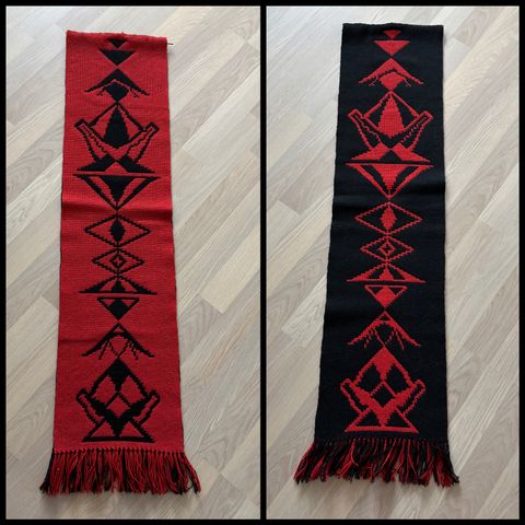 Täkänä nimeltään Palapeli 160x48 cm. Design Maija Koksi-Mäkelä (1911-1982). Valmistaja Helmi Vuorelma Oy. Materiaali: pellava. Myydään ilman ripustustankoa (ripustusrenkaat löytyvät valmiiksi kiinnitettyinä täkänässä).