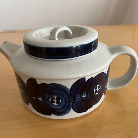 Arabian Anemone-sarjan sinikuvioinen käsinmaalattu teekannu, suunnittelija Ulla Procopè. Ollut tuotannossa 60- ja 70-luvulla. Ikäisekseen hienokuntoinen kannu, kiiltävä pinta. Ei kuitenkaan täysin virheetön (kts. kuvat).