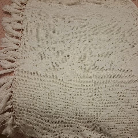 Kaunis, puuvillalangasta virkattu sängynpäällinen, mutta käy vaikka verhoksi. Väri lähinnä vaalean keltainen/okrankeltainen.