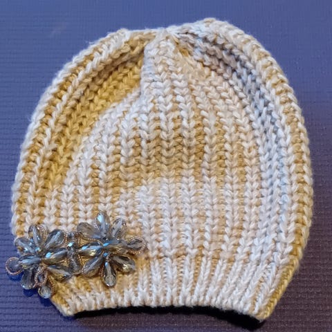 Valkoinen neulottu hiippapipo, Kuvassa 2 näkyy mitta. Pesuohje: +40 konepesu. Hp 8€ +pk