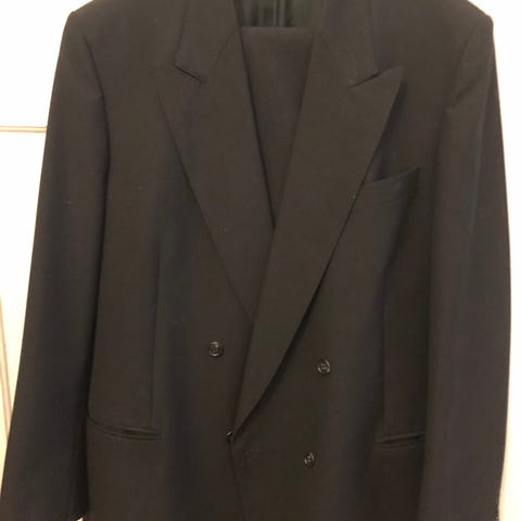 Retro miesten tumma puku. Mittoja: housujen vyötärön ympärysmitta noin 114, takin noin 136. Lahkeen sisäpituus 78, takin hihan ulkopituus 65. Nouto Espoon Olarista.