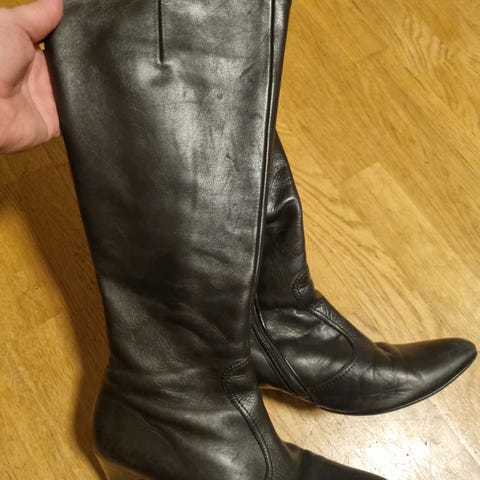 Gaborin nahkasaappaissa pitkä, KAPEA varsi pehmeää nahkaa ja n.6cm korko. Koko 5 1/2, tekstiilivuori. Varren pituus maasta 42cm, pohkeen ympärys n. 35cm. Tyylikkäät kengät hameen kanssa, ja mahtuvat myös hyvin housun lahkeen alle. Yleisilmeeltään siistit kengät, vasemmassa kannassa kulumisjälkeä autolla ajamisesta.