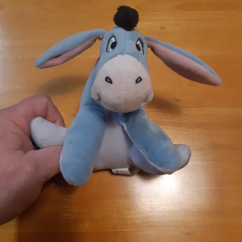 Ihaa on pieni, siniharmaa ja vaaleanpunaisin yksityiskohdin varustettu pehmolelu. Materiaali on pehmeää kangasta, ja nukke on suunniteltu lasten leikkeihin. Haku Porista tai postitus ostajalle.