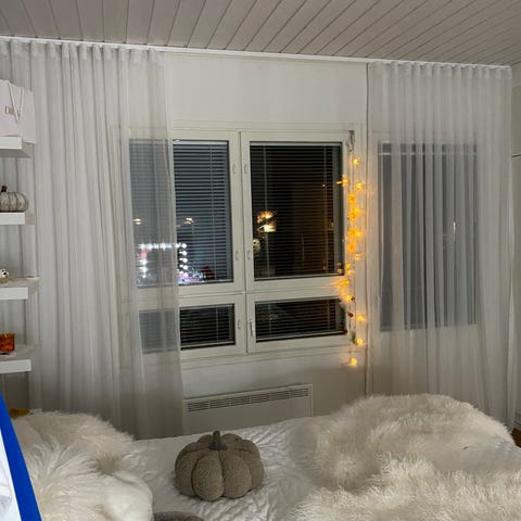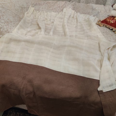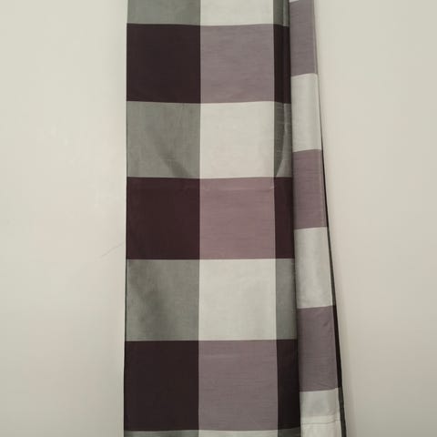 Designers Guild verho, jossa on monivärinen raitakuosi.. Soveltuu sisustuskäyttöön, esimerkiksi ikkunan verhoksi. Materiaali on hieman kiiltävää ja laadukasta kangasta. Samasta kankaasta kaksi tyynyä, vetoketjut puuttuvat. Yhteishinta 55 €.