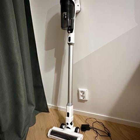 Erittäin siisti varsi-imuri laturin ja kahden lisäsuulakkeen kera.