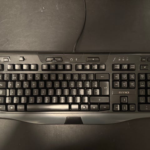 Myydään Logitech G105 merkkinen pelinäppäimistö, malli: Y-U0013. Näppäimistössä on 6 ohjelmoitavaa G-painiketta. Päältä näppäimistö on musta ja alhaalta punainen.