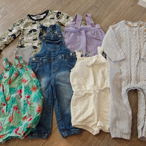 Velourhousu, merkki Lingon & Blåbär, koko 90 cm, väri koralli. Sukkahousut, merkki name it, koko 98 cm, vöri kellanvihreä. Kimallepaita, merkki Lindex, koko 86 cm, väri musta. Raitabody, merkki Kappahl, koko 86 cm, väri tummanpunainen.