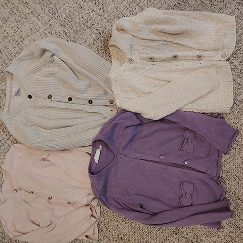 Ihanat, lähes käyttämättömät neuletakit kokoa 98/104 cm. Hinta kolme euroa kappale tai yhteensä vitosen.