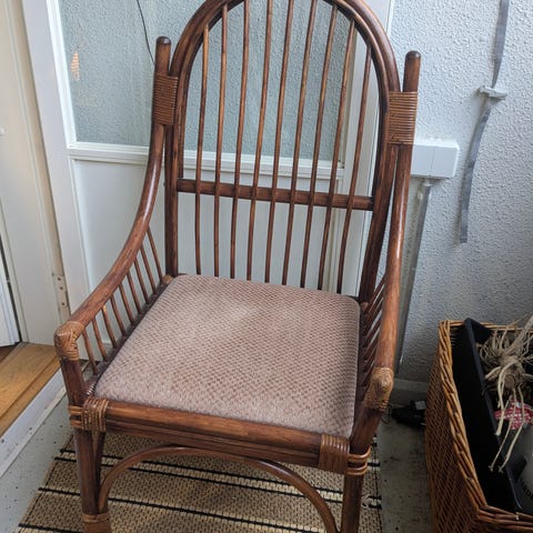 Harmaa rottinkinen tuoli, jonka korjaaminen jää ostajalle. Rottinkeja katkeillut. Meillä toiminut istuinpäällisen kanssa näin, myös vaatteiden laskupaikaksi toimiva:)