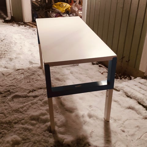 Pöydän voi säätää kolmeen eri korkeuteen, ja sen jalkojen välissä on kätevät johtokourut jatkojohdoille. Pöydän pinnassa muutamia naarmuja.