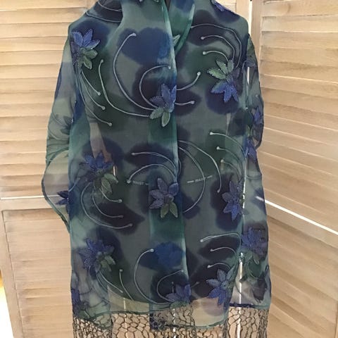 Käyttämätön ruskea huivi glittereillä, kokoa 55 x 190 cm plus hapsut. Polyamidia.