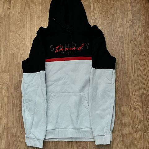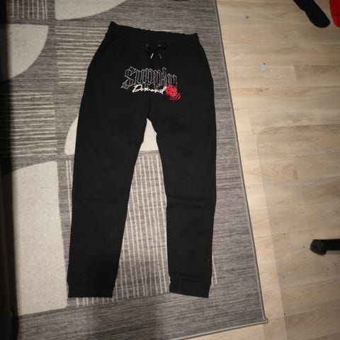 Supply & Demand punainen huppari koko S ja housut koko M. Hupparissa on mustat nyörit ja teksti etupuolella sekä takana. Housuissa on sivutaskut ja joustava vyötärö. Materiaali vaikuttaa pehmeältä ja mukavalta, sopii arkikäyttöön. Hieman nukkaantunut ja housun pultussa liimatahra. Näkyy kuvassa.