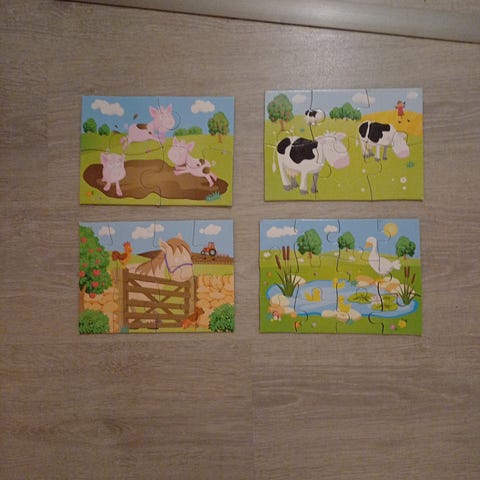 Lasten palapelejä 3kpl kaikissa palat tallella. Yksi pala vähän vaurioitunut näkyy kuvassa ja yhden paketin sisäkanteen piirretty.
