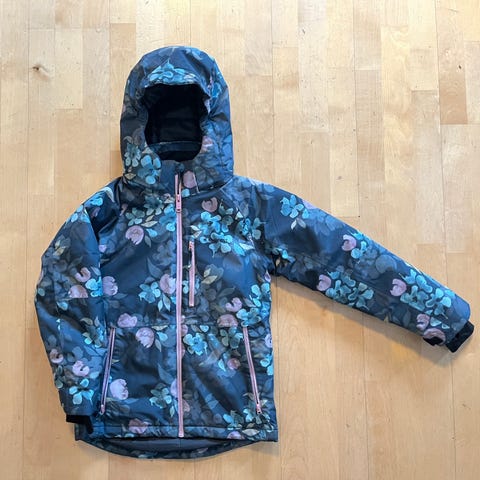 Toppatakki ominaisuuksilla (veden-ja tuulenpitoisuus), sisällä vyötärön lumilukko, irrotettava huppu ja huoun reunassa irrotettava karva. Sopii myös hyvin lasketteluun.