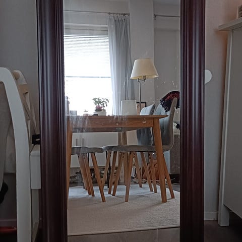 Keltainen askon peilipöytä peili on ehjä vain blurrattu tavarat kuvasta