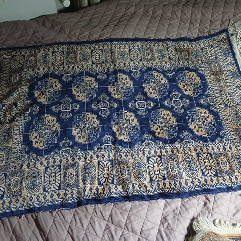 Käyttämätön silkkimatto 2000 luvun alusta. Punainen silkkimatto, jossa on sinisiä neliöitä ja vaaleanpunaisia sekä punaisia kukkakuvioita. Säilytetty lämpimässä ja kuivassa tilassa.